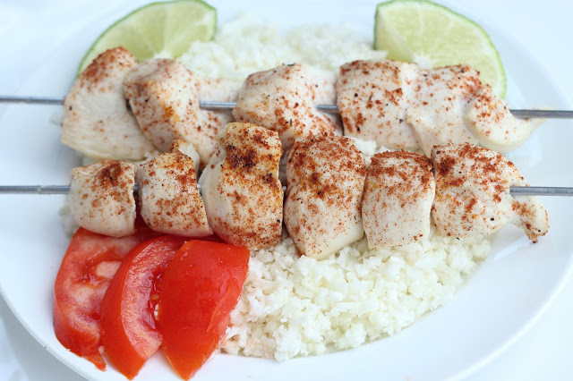 - In a small bowl, whisk together the oil, vinegar, and lime juice. Season with chili powder, paprika, onion powder, garlic powder, cayenne pepper, salt, and black pepper. Place the chicken in a shallow baking dish with the sauce, and stir to coat. Cover, and marinate in the refrigerator at least 1 hour. Preheat the grill for medium-high heat. Thread chicken onto skewers, and discard marinade. Lightly oil the grill grate. Grill skewers for 10 to 15 minutes, or until the chicken juices run clear.