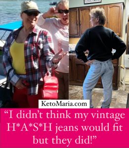 “I bought a vintage pair of H*A*S*H jeans for motivation to lose another 10#. The waist are 28″ and I was 33″ last week so I didn’t think they’d fit, but they did! I’ll be wearing them for my 45th class reunion next summer!
