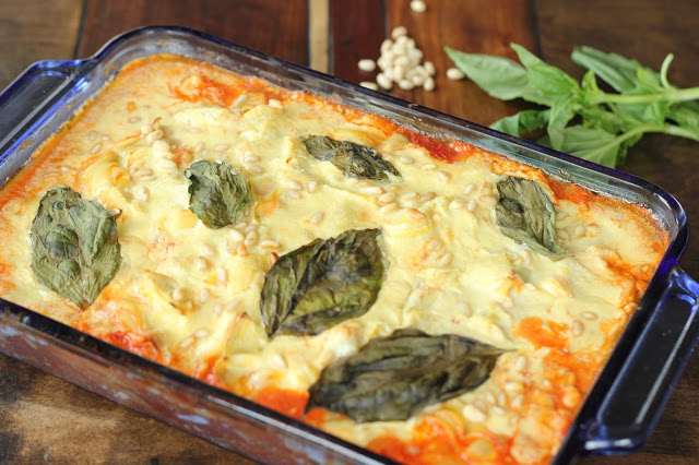 - To assemble, spread about half the marinara sauce over the bottom of an un-greased 3-quart shallow baking dish. Layer the Protein noodles in the dish. Spread with one-half of the artichokes and one-half of the goat cheese sauce, then a layer of chopped basil and pine nuts. Repeat layering Protein noodles, artichokes, and goat cheese sauce. Top with basil leaves and sprinkle with pine nuts.
