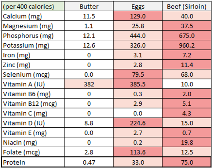 Protein foods carry more micronutrients—especially when you include leaner cuts of meat, organ meats, and seafood.